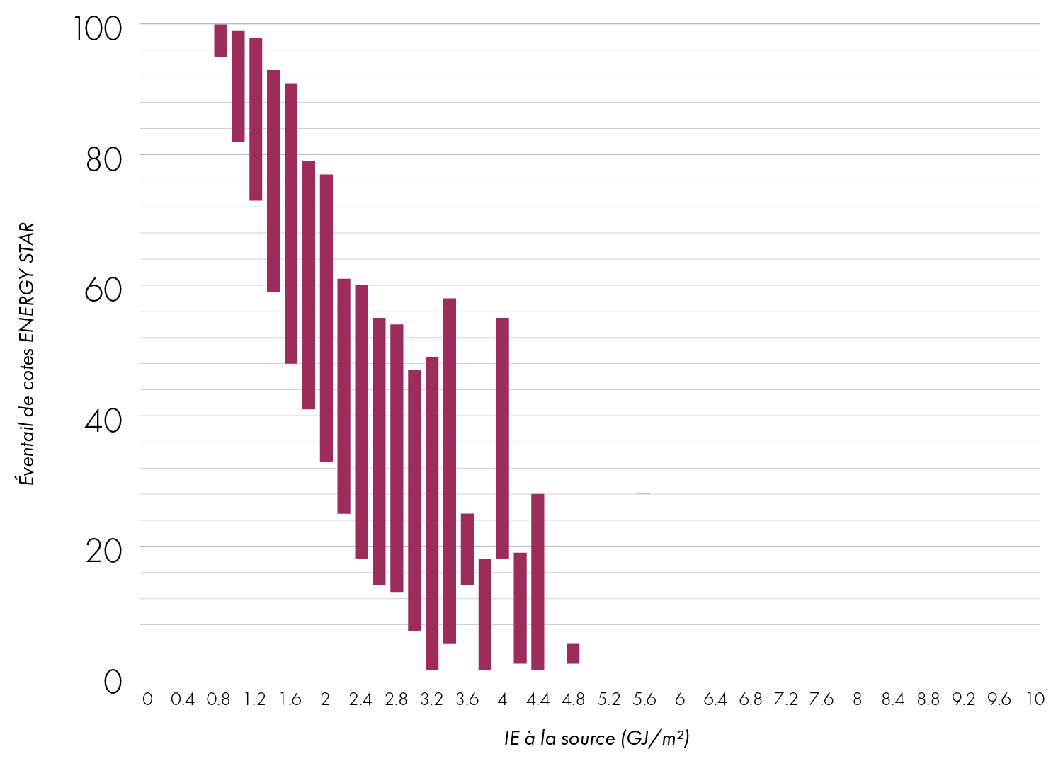 Ce diagramme montre l’éventail (du 10e au 90e percentile) de cotes ENERGY STAR en fonction de l’IE à la source.