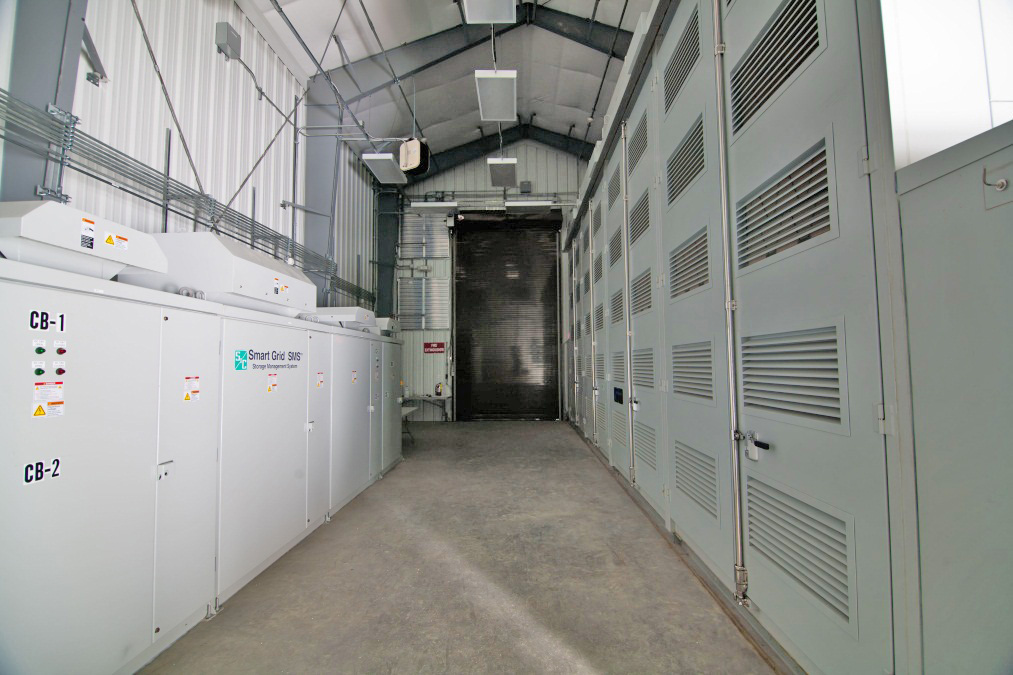 Batterie NaS (à droite) et système de gestion de stockage (à gauche) situé à l’intérieur du bâtiment préfabriqué à Field (C.-B.)