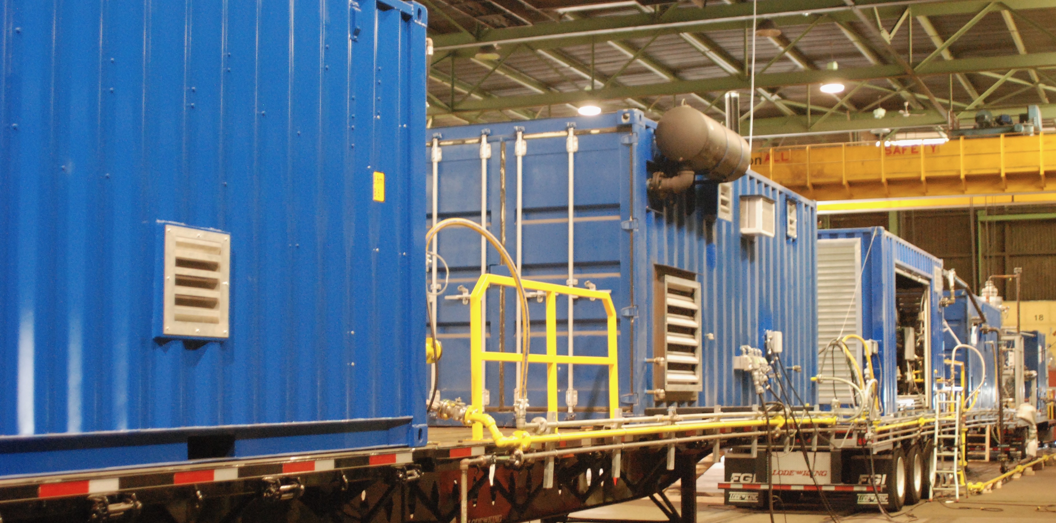 Vue extérieure de la tuyauterie et des câbles interconnectés le long des unités conteneurisées de compression du gaz naturel, de production d’électricité, le local électrique, les services publics, le compresseur à air de combustion, la salle de contrôle et le châssis de VCI tels qu’installés sur une série de deux remorques à plateformes plates (flat deck trailer) de 53 pieds et d’une remorque à plateforme à niveaux (step deck trailer) de 53 pieds.