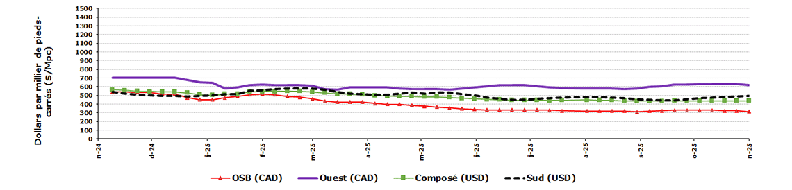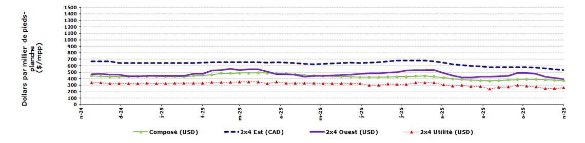 Dollars par millier de pieds-planche | 21 novembre 2025 | 14 novembre 2025 | Moyenne de 4 semaines | Moyenne de 52 semaines |