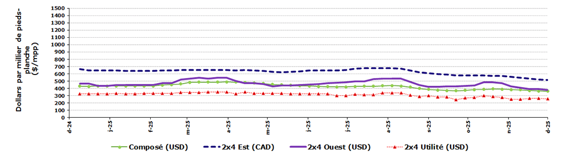 Nota : épinette-pin-sapin de l’Est 2x4 de qualité #2 et meilleure; et le prix composite publié par Random Lengths et épinette-pin-sapin de l'Ouest 2x4 de qualité #2 et meilleure et séché au séchoir