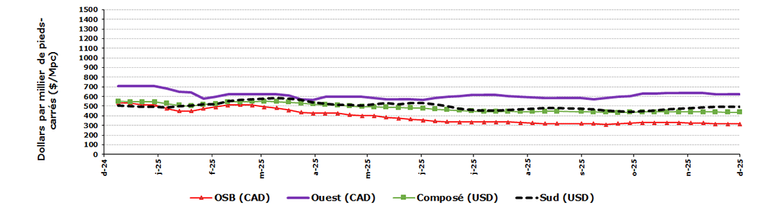 Nota : le prix composite des panneaux de construction publié par Random Lengths; 15/32" 4 plis extérieur du Sud, 1/2" 4 plis extérieur de l’Ouest et 7/16" panneaux de lamelles orientées du Centre Nord
