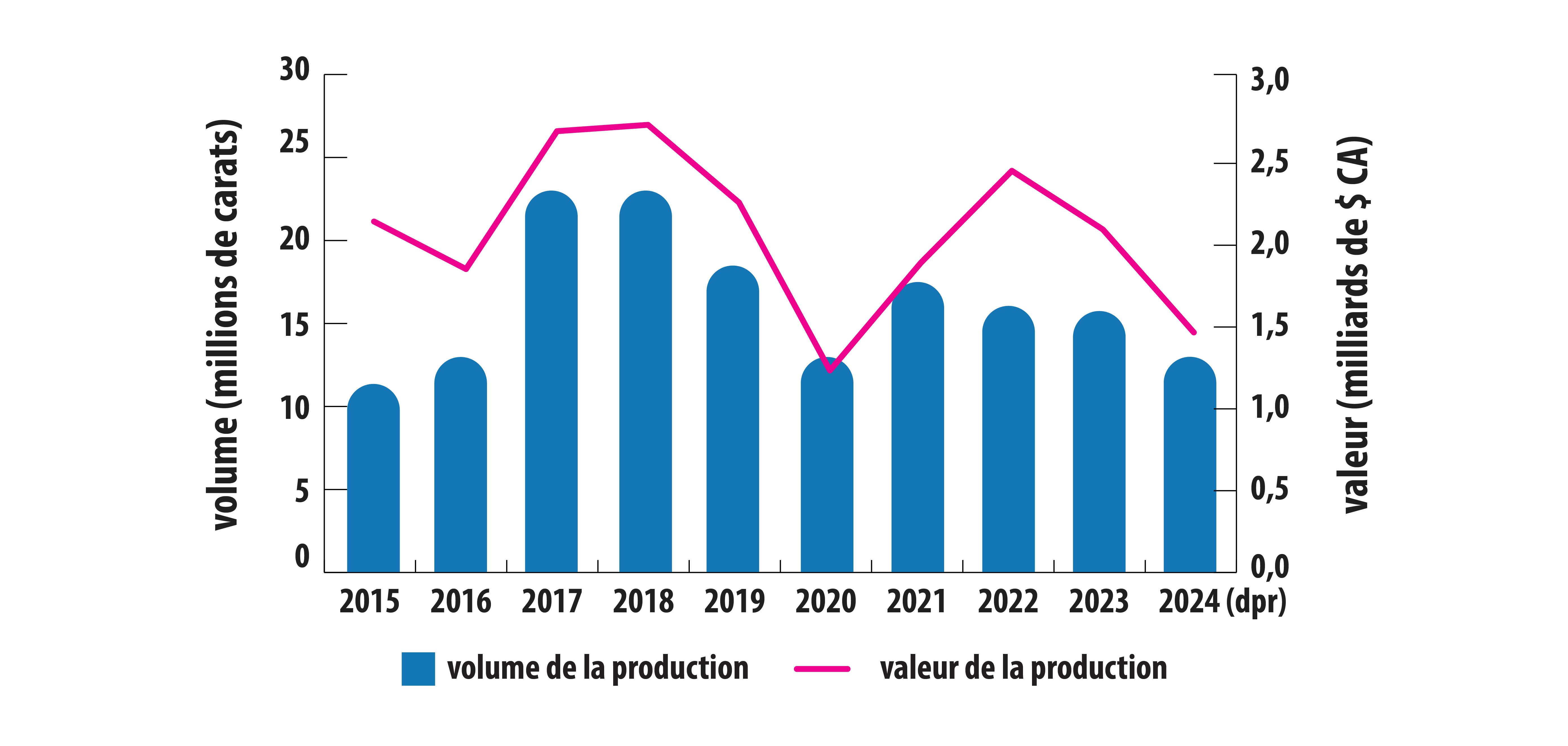 Ce diagramme en barres montre le volume annuel de production de diamants bruts au Canada, de 2015 à 2024. De 11,7 millions de carats en 2015, le volume de production a augmenté pour atteindre un niveau record de 23,2 millions de carats en 2017 et en 2018. Cependant, il a ensuite chuté de 20 % pour atteindre 18,6 millions de carats en 2019, avant de baisser à nouveau de 30 % pour atteindre 13,1 millions de carats en 2020. En 2021, la production s’est élevée à 17,6 millions de carats, avant de diminuer légèrement à 16,3 millions de carats en 2022, puis à 16,0 millions de carats en 2023. En 2024, le volume de production s’est élevé à 13,3 millions de carats. Une ligne représentant la valeur de la production annuelle de diamants bruts du Canada au cours de la même période est superposée au diagramme en barres. De 2,14 milliards de dollars et 1,85 milliard de dollars en 2015 et en 2016, respectivement, la valeur de la production canadienne de diamants bruts a augmenté pour atteindre environ 2,7 milliards de dollars en 2017 et en 2018, avant de diminuer à 2,25 milliards de dollars en 2019. La valeur de la production a ensuite fortement diminué, de 45 %, pour atteindre 1,25 milliard de dollars en 2020, avant d’augmenter à 1,90 milliard de dollars et à 2,44 milliards de dollars en 2021 et en 2022, respectivement. En 2023, la valeur de la production a diminué pour atteindre 2,09 milliards de dollars, puis a chuté de 30 % pour atteindre 1,47 milliard de dollars en 2024.