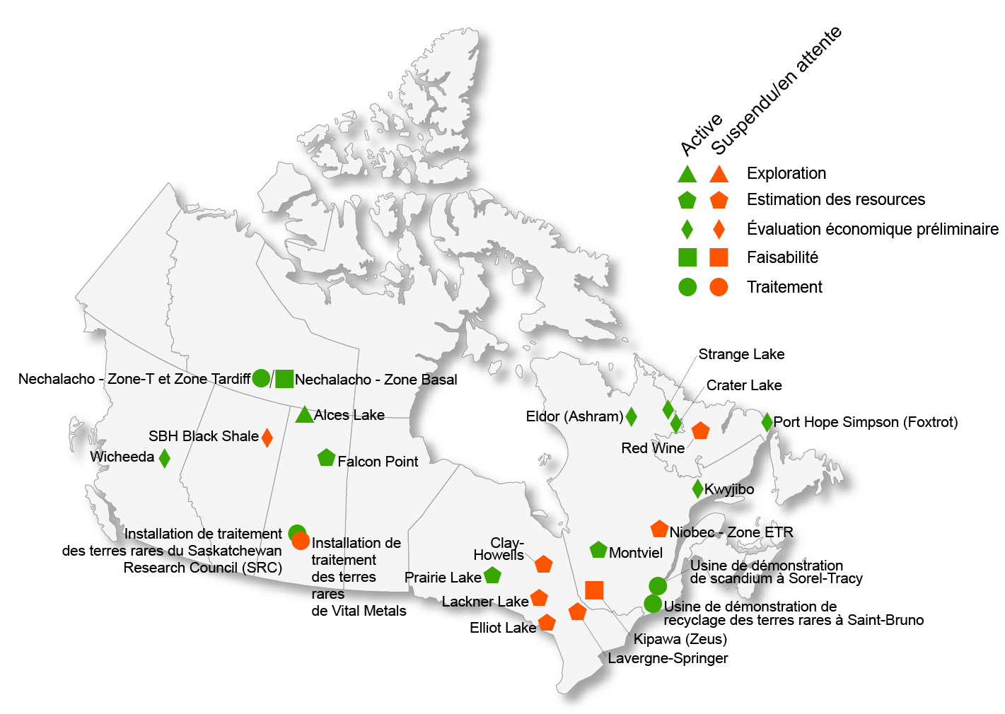 - Comprend les réserves et les ressources minérales (mesurées ou indiquées). Bien que les ressources en ETR du Canada continuent d’exister, les projets peuvent être en suspens et les sociétés qui exploitent ces ressources peuvent ne plus être solvables ou se concentrer sur d’autres gisements de minéraux ou d’autres secteurs d’activité.