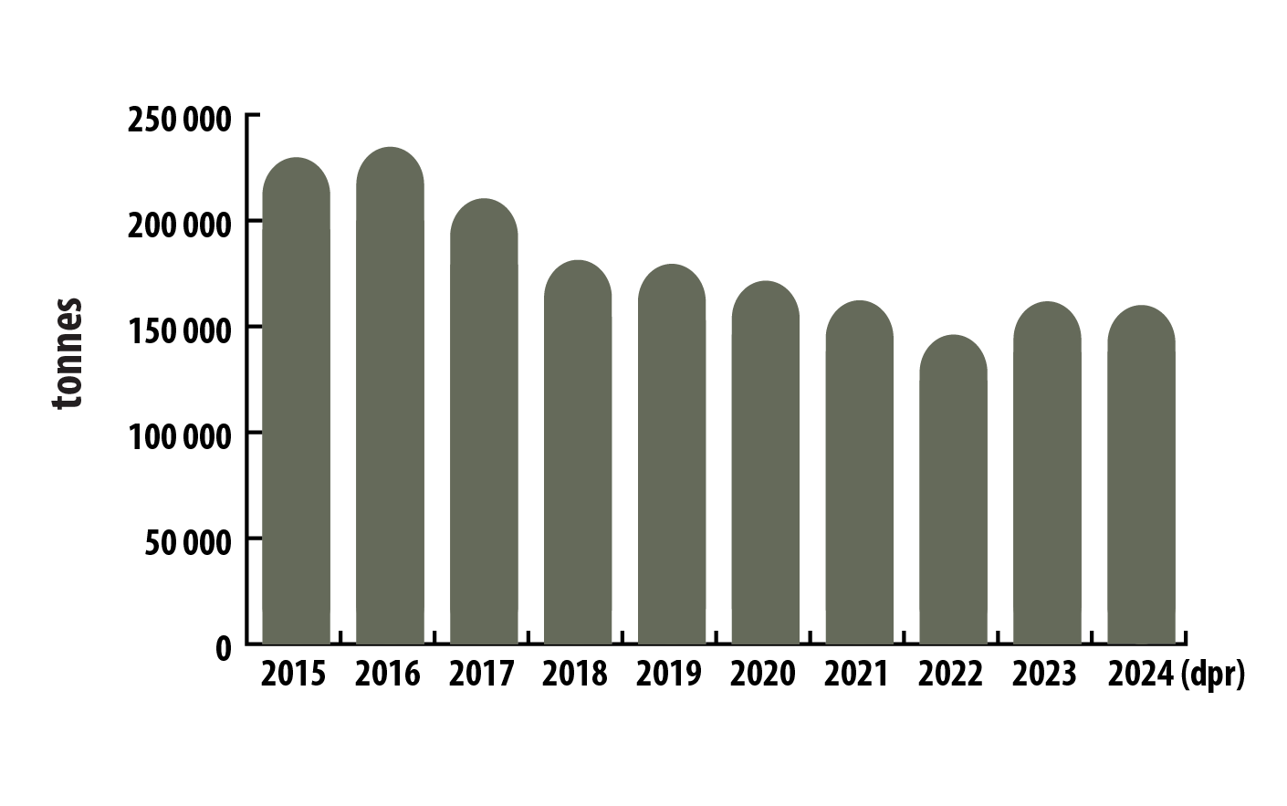 Ce diagramme à barres illustre la production de nickel annuelle au Canada de 2015 à 2024. En 2015, la production a atteint 225 351 tonnes, avant de se chiffrer à 230 210 tonnes en 2016, son plus haut niveau depuis 10 ans. La production a ensuite baissé graduellement, atteignant un creux de 122 115 tonnes en 2022. Depuis, la production s’est stabilisée, se chiffrant autour de 125 000 tonnes par an.