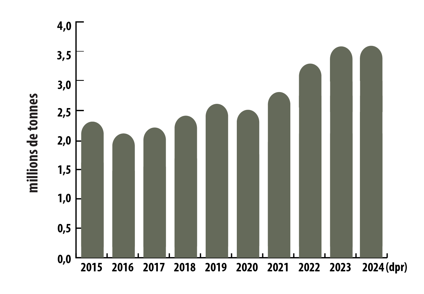 Ce diagramme à barres illustre la production minière mondiale de nickel de 2015 à 2024. La production est passée de 2,3 millions de tonnes en 2015 à 2,1 millions de tonnes en 2016, avant de remonter à 2,6 millions de tonnes en 2019. Après une légère baisse à 2,5 millions de tonnes en 2020, la production a augmenté régulièrement pour atteindre 2,8 millions de tonnes en 2021, 3,3 millions de tonnes en 2022 et 3,6 millions de tonnes en 2023 et en 2024.
