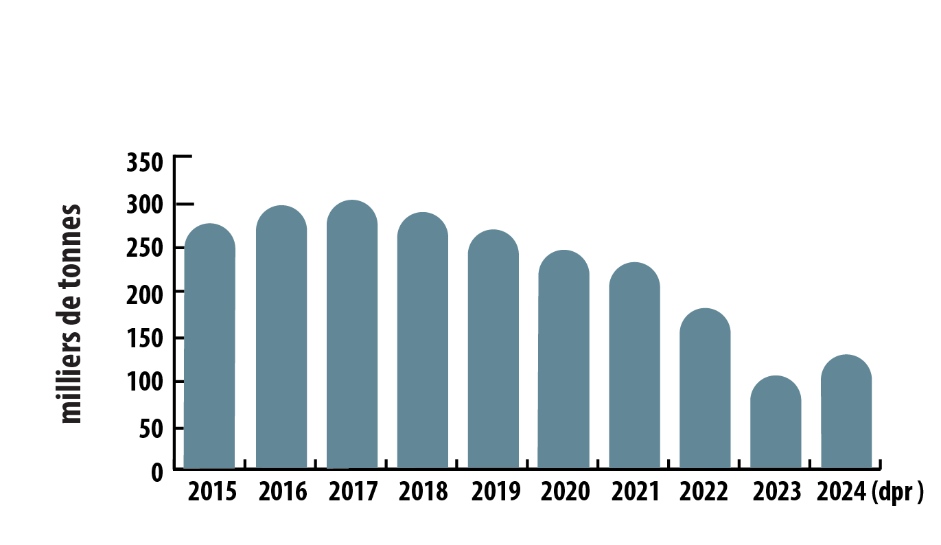 - Production canadienne de zinc affiné, de 2015 à 2024 (dpr)