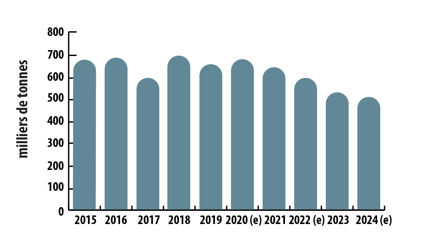 Ce graphique à barres montre la production de zinc affiné du Canada de 2015 à 2024. La production était de 683 118 tonnes en 2015 et a augmenté légèrement pour atteindre 691 389 tonnes en 2016. En 2017, la production a fortement diminué pour atteindre le niveau le plus bas de la décennie, soit 598 438 tonnes, avant de rebondir pour atteindre le niveau le plus élevé de la décennie, soit 696 591 tonnes, en 2018. Elle a ensuite diminué pour atteindre 654 971 tonnes en 2019, avant d’augmenter pour atteindre 680 245 tonnes en 2020. Au cours des années suivantes, la production a baissé constamment pour se chiffrer à 640 718 tonnes en 2021, à 599 900 tonnes en 2022, à 531 600 tonnes en 2023 et à 521 000 tonnes en 2024.