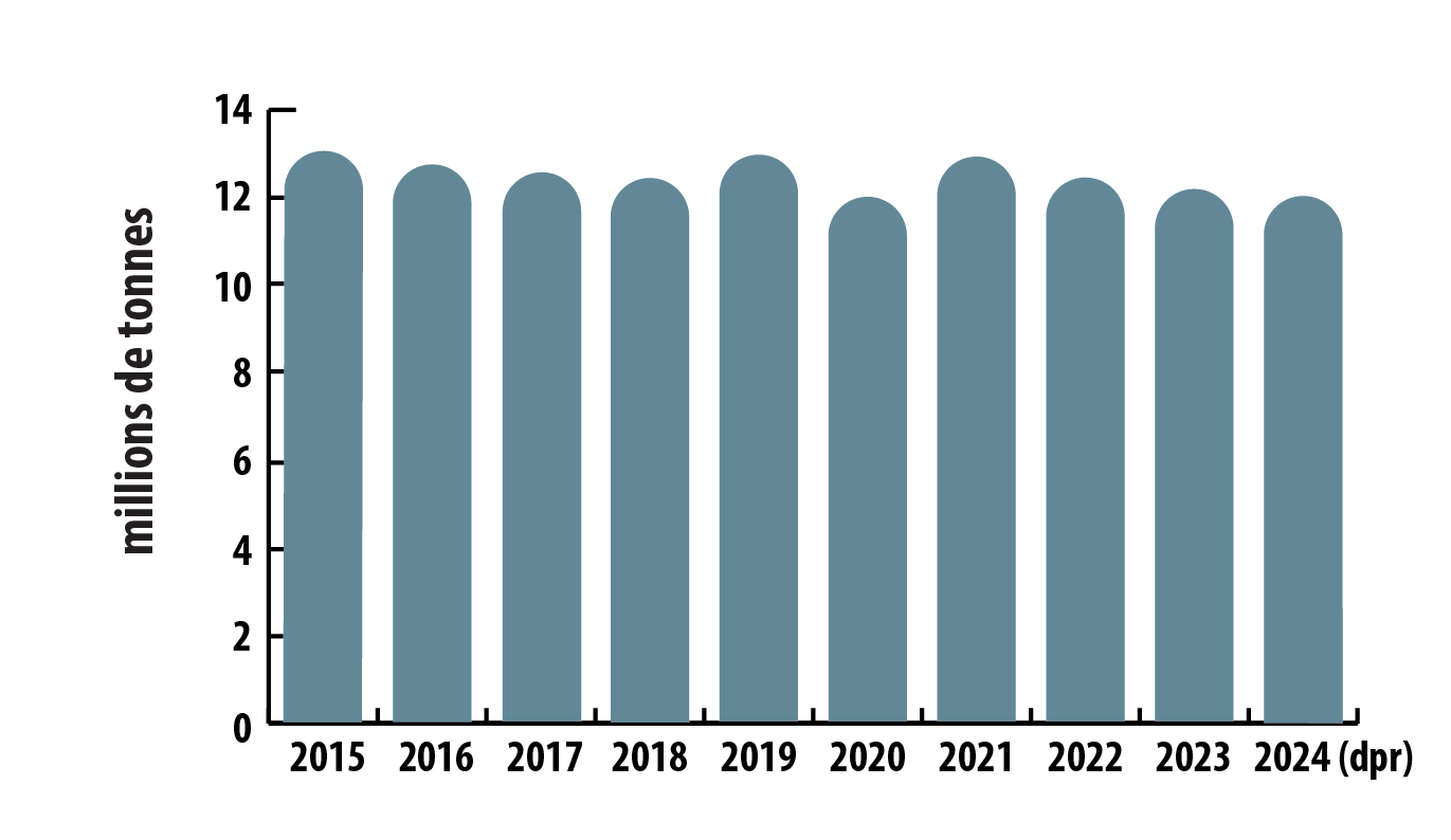 Production minière canadienne de zinc, de 2015 à 2024 (dpr)