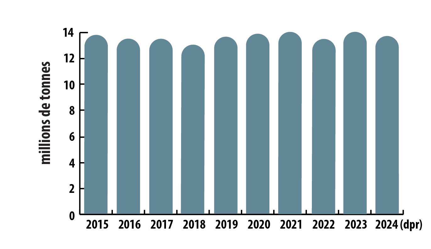 Production mondiale de zinc affiné, 2015 à 2024 (dpr)