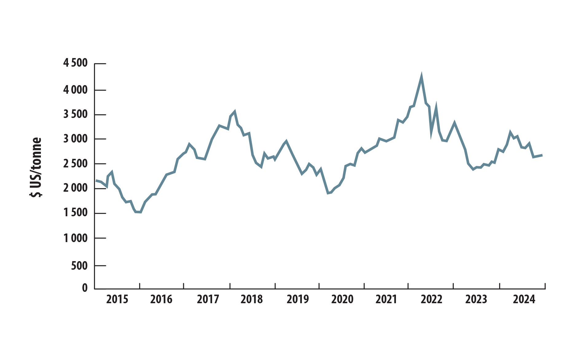 Les prix ont ensuite baissé pour atteindre 3 129 $US en décembre 2022 et 2 502 $US en décembre 2023. En 2024, les prix ont atteint un sommet de 3 106 $US en avril, avant de baisser pour se chiffrer à 2 655 $US en décembre.