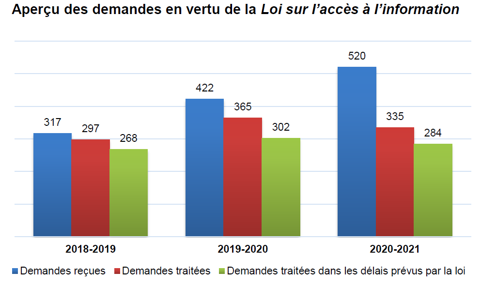 En 2020-2021, 520 demandes ont été reçues, 335 demandes ont été traitées et 284 demandes ont été traitées dans les délais prescrits.