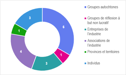 Graphique circulaire illustrant les réponses obtenues dans le cadre de l’engagement: groupes autochtones = 6, associations de l’industrie = 4, individus = 3, entreprises de l’industrie = 3, groupes de réflexion à but non lucratif = 1, provinces et territoires = 1.