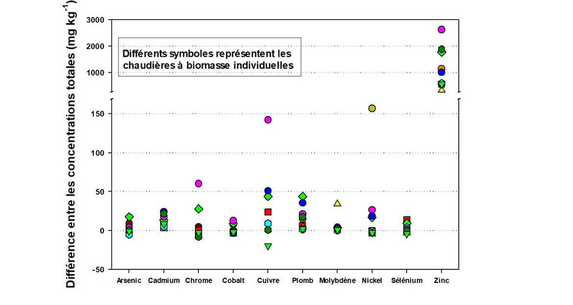 Figure 4. Différences de teneur en éléments traces dans les échantillons appariés de cendres volantes et de cendres résiduelles pris dans neuf chaudières à biomasse canadiennes. (Les différents symboles représentent chacun une chaudière différente.)