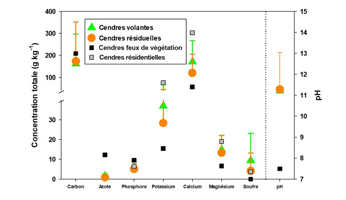 Pour tous les types de cendres, les concentrations d’azote, de soufre et de phosphore sont généralement faibles par rapport à celles du magnésium, du potassium et du calcium. Les concentrations moyennes de nutriments dans les cendres volantes sont supérieures à celles des cendres résiduelles. En comparant les cendres de feux de végétation aux cendres volantes et résiduelles, on observe une plus grande concentration d’azote et de phosphore, une valeur de pH plus faible, et une concentration plus faible de potassium, de calcium, de magnésium et de soufre. La concentration de potassium et de calcium est plus élevée dans les cendres résidentielles que dans les cendres volantes et résiduelles.