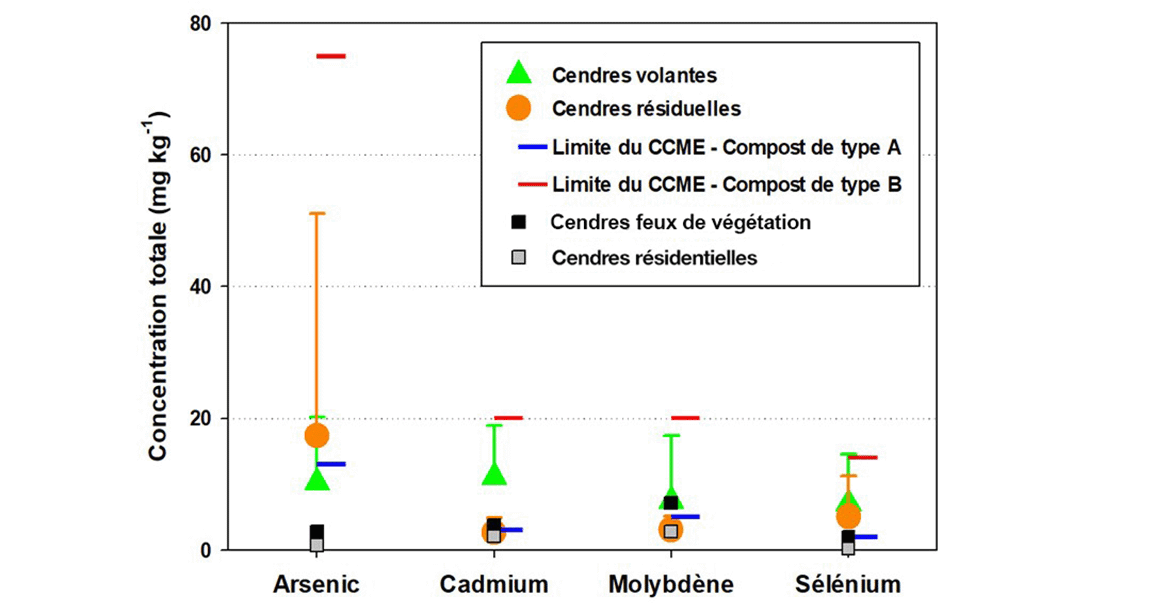 Les concentrations moyennes d’arsenic, de cadmium, de molybdène et de sélénium dans les cendres volantes et résiduelles sont généralement plus élevées que la limite pour le compost de type A établie par le CCME, mais inférieures à celles de la limite établie pour le compost de type B. Les cendres avec de telles concentrations font l’objet d’une utilisation « avec restrictions ». Ces cendres peuvent être appliquées aux sols, à condition que les règlements provinciaux et territoriaux à cet égard soient respectés.