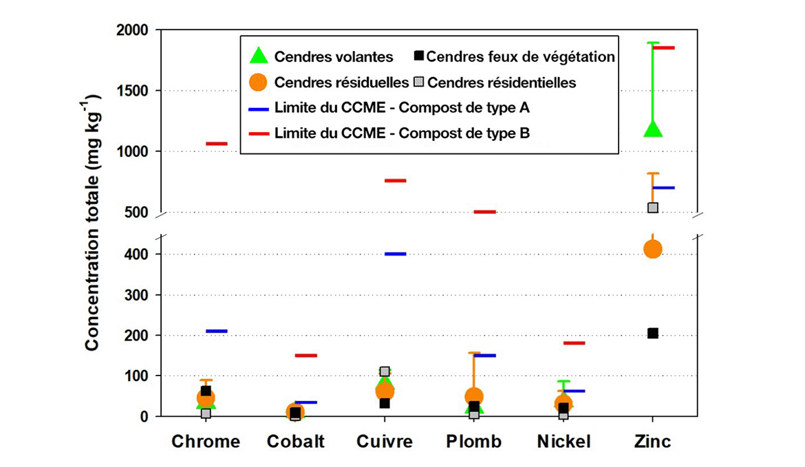 Les concentrations moyennes de chrome, de cobalt, de cuivre, de plomb et de nickel dans les cendres volantes, résiduelles, issues de feux de végétation et résidentielles sont toutes inférieures à la limite établie pour le compost de type A. La cendre de bois affichant de telles concentrations est considérée comme étant « sans restriction d’utilisation » et peut être utilisée comme amendement du sol dans toute application.