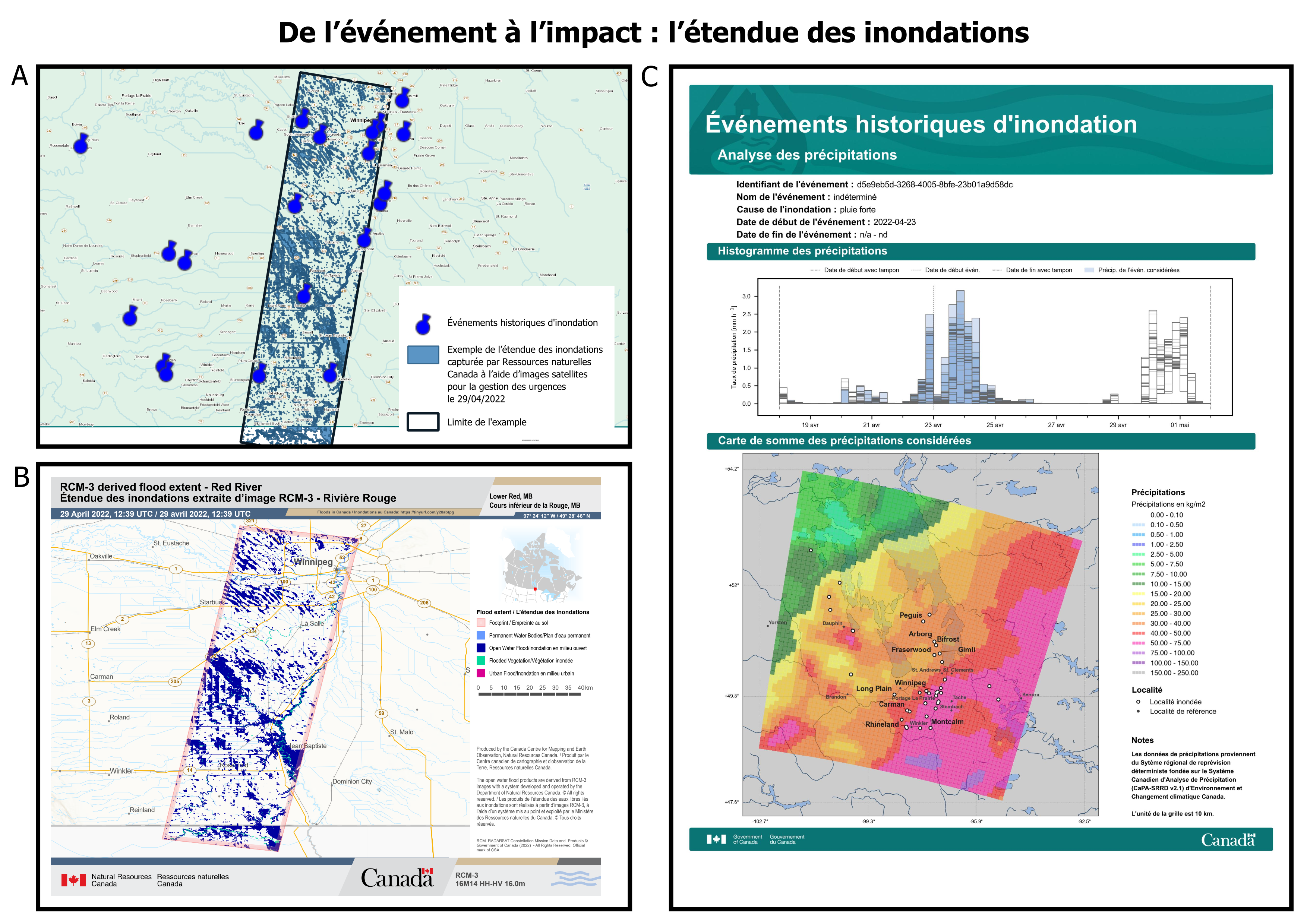 Afin d’améliorer l’exhaustivité des données, des efforts ont été déployés pour garantir l’inclusion des événements cartographiés à l’aide d’images satellites pour la gestion des urgences de l’équipe de Service de géomatique d’urgence (SGU) de Ressources naturelles Canada. Chaque événement de la couche EHI ainsi que les enregistrements des précipitations observées avant et pendant l’événement peuvent être reliés aux zones inondées correspondantes identifiées par les SGU. Combinées, ces ensembles de données offrent une compréhension plus complète des inondations, depuis leurs causes météorologiques jusqu’à leurs impacts sur le paysage. Par exemple, l’inondation d’avril 2022 au Manitoba a touché 38 municipalités. En combinant les deux ensembles de données, l’analyse montre que l’inondation a été causée par plusieurs jours de fortes précipitations dans les jours qui ont précédé l’événement.