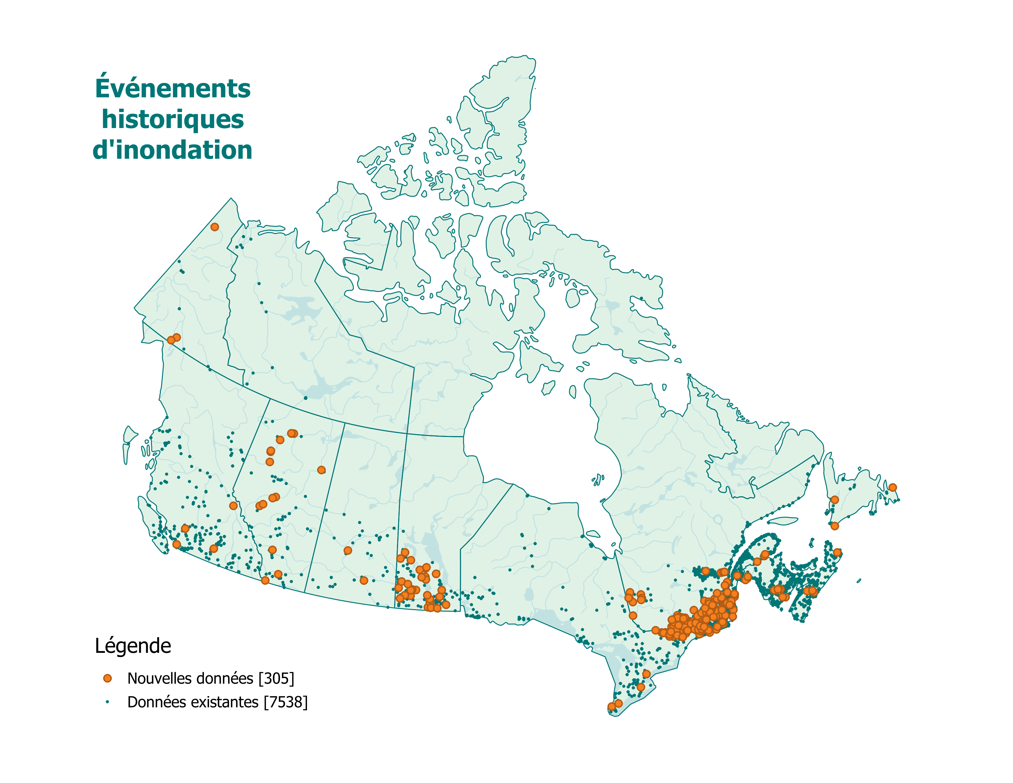 Événements historiques d’inondation au Canada de 1696 à 2025. Cette carte comprend 305 nouvelles inondations (jusqu’au 22 juillet 2025), en plus des 7 538 inondations déjà répertoriées.